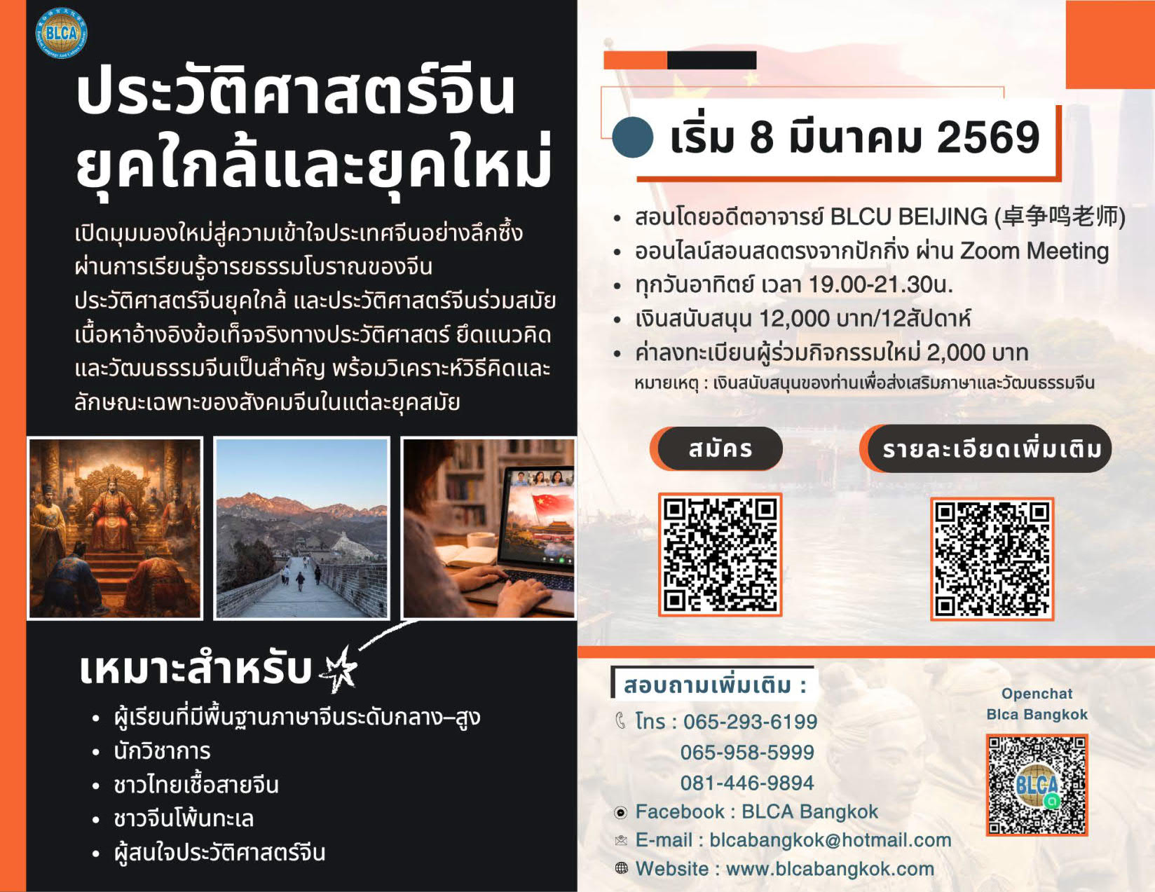 ค่อย ๆ กลายเป็นสังคมกึ่งอาณานิคมกึ่งศักดินา จนถึงความพยายามในการกู้ชาติและรักษาชาติของปัญญาชนชาวจีนในประเทศ เช่น ขบวนการหยางอู้และการปฏิรูปอู๋ซวี่ รวมถึงการตอบสนองต่อการรุกรานจากต่างชาติ และการฉ้อราษฎร์บังหลวง และไร้ความสามารถของรัฐบาลราชวงศ์ชิง โดยขบวนการปฏิวัติ เช่น กบฏไท่ผิงและกบฏนักมวย นอกจากนี้ ยังบรรยายถึงการปฏิวัติซินไฮ่ที่ได้โค่นล้มระบอบจักรวรรดิศักดินา เริ่มต้นระบอบสาธารณรัฐประชาธิปไตย รวมถึงกระแสการปลดปล่อยความคิดจากขบวนการวัฒนธรรมใหม่ พร้อมทั้งศึกษาวิเคราะห์เหตุการณ์หลังขบวนการ 4 พฤษภาคม การก่อตั้งพรรคคอมมิวนิสต์จีนได้นำมาซึ่งทิศทางใหม่ของการปฏิวัติในจีน จนกระทั่งการสถาปนาสาธารณรัฐประชาชนจีน ซึ่งทำให้ชาติเป็นอิสระและประชาชนได้รับการปลดปล่อย่ ประวัติศาสตร์จีนร่วมสมัย เริ่มตั้งแต่วันที่ 1 ตุลาคม ค.ศ. 1949 จนถึงปัจจุบัน สามารถแบ่งออกเป็น 3 ช่วงคร่าว ๆ ดังนี้ : ออนไลน์สอนสดตรงจากปักกิ่ง ผ่าน Zoom Meeting โดยรองศาสตราจารย์จั๋วเจิ้งหมิง ผู้เชี่ยวชาญการสอน วันอาทิตย์ เวลา 19.00-21.30 น. (สัปดาห์เว้นสัปดาห์) ค่าลงทะเบียนผู้ร่วมกิจกรรมใหม่ 2,000 บาท