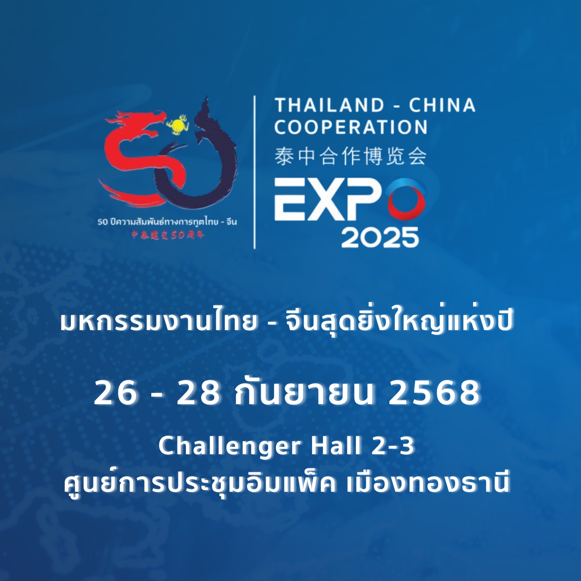 " Thailand-China Cooperation Expo 2025 วันที่ 26-28 กันยายน 2568 เวลา 10.00 - 18.00 น. ณ ชาเลนเจนส์ ฮอลล์ 2-3, อิมแพ็ค เมืองทองธานี "